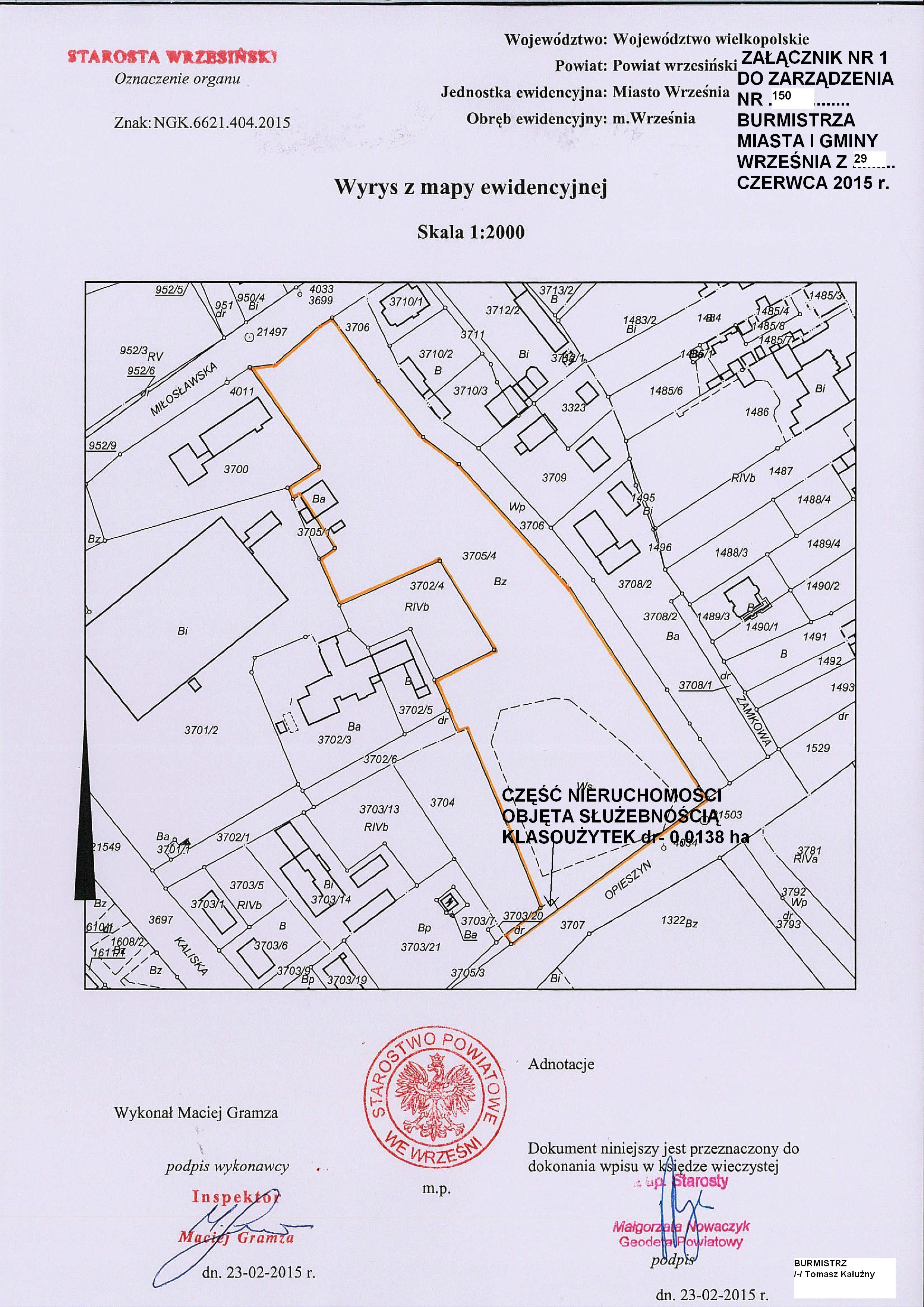 §2. Określona w §1 służebność obejmuje części działki nr 3705/4 stanowiącą pas gruntu o powierzchni 0,0138 ha, szczegółowy przebieg (zakres) przedmiotowej służebności określa załącznik graficzny stanowiący integralną część niniejszego zarządzenia.